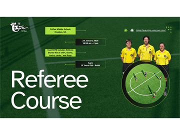 We are looking for passionate individuals to join our referee crew in Douglas, GA! While this course is open to everyone ages 13 to adult, TCSA has a specific and urgent need for Adult Officials.